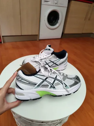 Zapatillas deportivas Asics con un diseño clásico y cómodo. Las vendo porque es un 46 pequeño, creo que a un 45 de toda la vida le ajustan perfectamente. Muy poco uso - Combinación de colores blanco y verde. - Cierre con cordones.