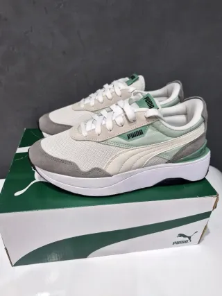 Zapatillas Puma con un diseño moderno y cómodo. - Combinación de colores verde y blanco. - Detalles en ante gris.