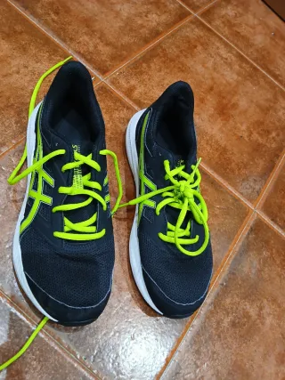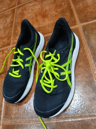 Poco uso. Zapatillas deportivas Asics con un diseño moderno y llamativo. - Combinación de colores negro y verde vibrante. - Cordones de ajuste. - Suela blanca.