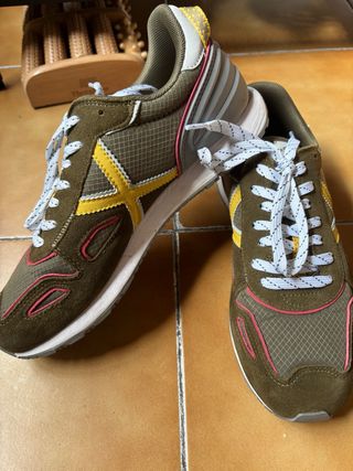 Zapatillas Munich Massana Evo 556 con un diseño deportivo y moderno. - Combinación de colores verde oliva y amarillo. - Detalle de ribete en color rosa. - Cordones blancos con detalles negros.