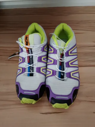 Zapatillas de trail running Salomon Speedcross 3. - Diseño en blanco y morado. - Detalles en verde lima. - Cierre con cordones. - Suela con tacos para agarre.