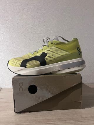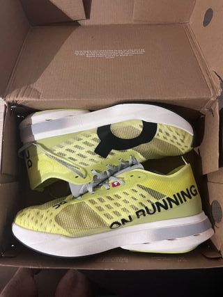 Zapatillas deportivas de la marca On Running. Nuevas sin estrenar. Precio en tienda 280€. Con placa de carbono. - Color verde y blanco. - Talla 45.