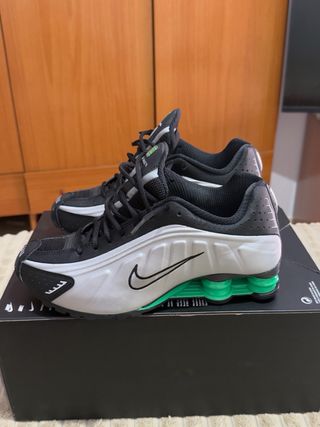 Zapatillas Nike Shox con un diseño moderno y llamativo. - Combinación de colores negro y verde vibrante. - Detalle de Swoosh característico de Nike.