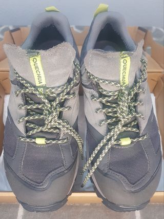 Vendo zapatillas impermeables de senderismo hombre talla 39. Están impecables, como nuevas a estrenar. Las utilicé sólo un día durante un viaje a Alemania hasta recuperar mi equipaje. -Marca: Quechua -Modelo: MH500 WTP M GREY 8504162 -Color: gris/verde -Características: Waterproof, EVOFIT, hombre -Talla: 39 EU
