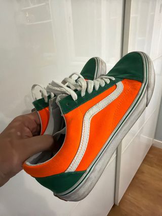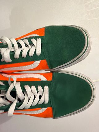 Zapatillas Vans Old Skool con un diseño llamativo en verde y naranja. - Combinación de colores vibrante. - Icónica banda lateral. - Cordones blancos. - Puestas solo 2 veces.