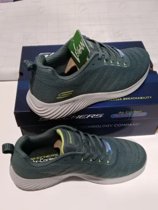 Zapatillas deportivas Skechers para hombre en tono verde y azulado. Perfectas para el día a día. - Diseño moderno y ligero. - Plantilla Memory Foam, que se amolda a la forma del pie y evita los impactos. - Cierre con cordones. - Detalle de logo en el lateral. - Suela con tecnología Ultra Light.