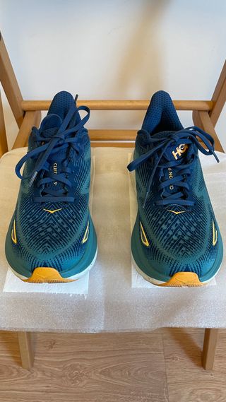 Zapatillas Hoka Clifton 9, talla 40. Están como nuevas (no guardé la caja). Las he usado apenas 5 veces; no se me adaptan al pie como me esperaba. Si conoces la marca y el modelo...sabras a qué precio están en el mercado y lo que te puedes ahorrar ☺️. 5 aldiz bakarrik erabili ditut eta nire oinera espero nuen modura egokitzen ez direlako saltzen ditut; berri berriak daude, nahiz eta kaxarik gabe gorde ditudan. - Diseño moderno en tonos azul y verde azulado. - Detalles en color dorado. - Suela de goma para mayor agarre.