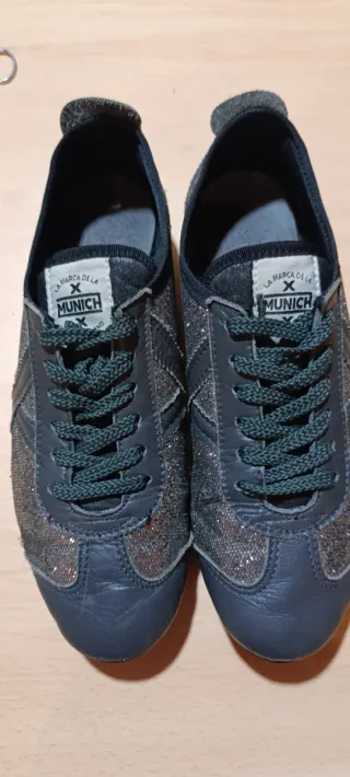 Zapatillas Munich de cuero con detalles brillantes. - Diseño deportivo. - Combinación de cuero y material con glitter. - Cordones en tono verde oscuro.