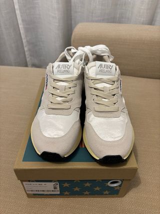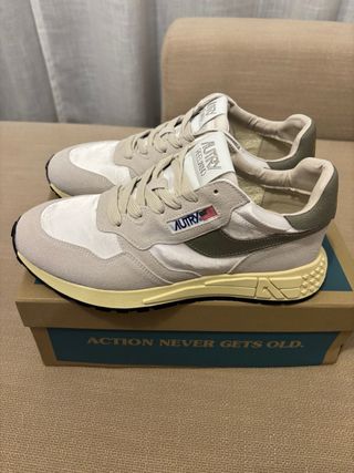 Zapatillas de la marca Autry, combinando nylon y ante. - Color principal beige con detalles en verde. - Talla 41.