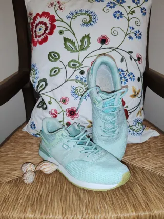 Zapatillas deportivas Xti en tonos verdes menta y turquesa. Perfectas para el día a día. Puestas muy poco. Me pasé al calzado respetuoso poco después de comprarlas y ya no me entra el pie. - Cierre de cordones. - Suela de goma. - Detalle de logo en el lateral.