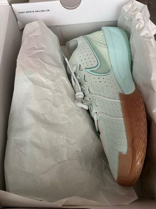 Zapatillas deportivas Nike G.T. CUT 3 con un diseño moderno y llamativo. - Combinación de colores oro y verde azulado. - Detalles perforados en la parte superior. - Suela con acabado translúcido.