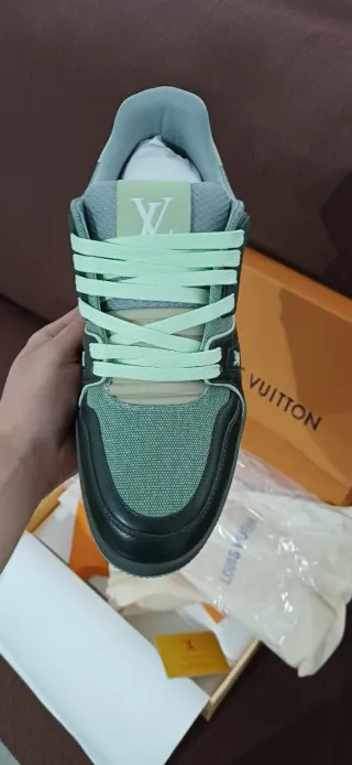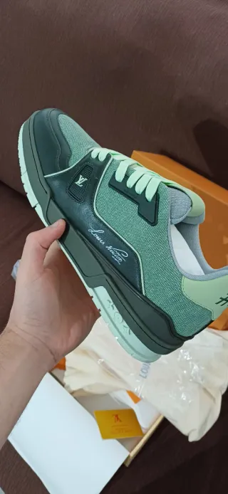 Zapatillas estilo LV Trainer en tonos verdes con detalles icónicos de la marca. Diseño llamativo, moderno y muy exclusivo, con suela gruesa y acabados premium. Perfectas para quienes buscan un look de lujo y streetwear. Están en excelente estado e incluyen su caja. Tallas disponibles 39-44 La compra a de efectuarse unicamente en la web : egox-5209.myshopify.com