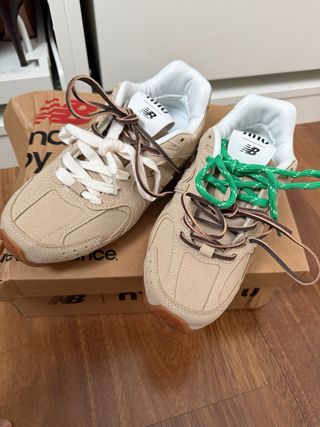 Zapatillas de edición especial New Balance para Miu Miu, a estrenar. - Diseño en ante color beige. - Cordones intercambiables en verde y marrón. - Suela de goma con detalle. - Talla 36.
