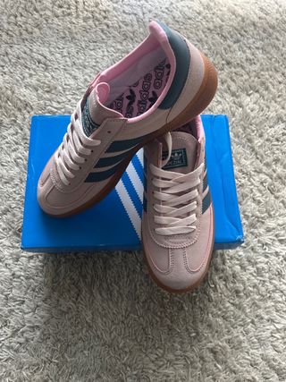 Zapatillas Adidas Gazelle en color verde con detalles en rosa. - Nuevas - Diseño clásico de Adidas. - Suela de goma. - Detalle de color rosa en el talón.