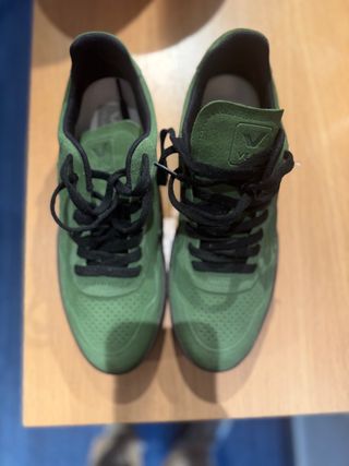 Zapatillas de la marca Veja en color verde. - Exterior de ante. - Cordones negros. - Detalle de logo en la lengüeta.