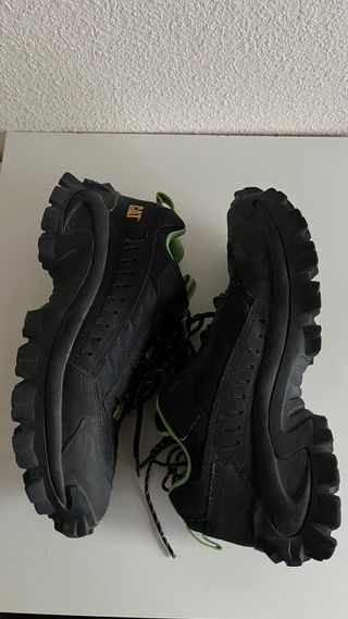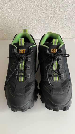 Zapatillas CAT Footwear modelo Intruder Oxford. - Diseño robusto y moderno. - Combinación de colores negro y verde vibrante. - Cordones negros con detalles en verde y gris reflectante. - Logo CAT en la lengüeta y lateral. Casi no se ha usado, puedes comprobarlo en la suela.