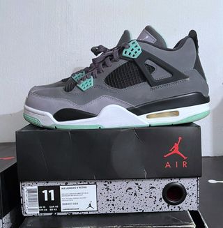 Zapatillas Air Jordan 4 Retro con detalles en verde menta y gris. - Diseño icónico de Jordan. - Combinación de colores única. - Talla EUR 45.
