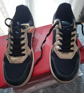 Zapatillas casuales de la marca Xti, con un diseño moderno y llamativo. - Combinación de colores verde negro y dorado. - Cierre con cordones. - Detalle de malla transpirable. - Muy buen estado, poco usadas