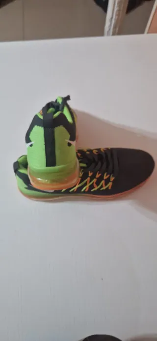 Zapatillas deportivas con un diseño moderno y llamativo. - Combinación de colores negro y verde vibrante. - Detalles en naranja en los cordones y la suela. - Suela con cámara de aire visible.