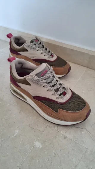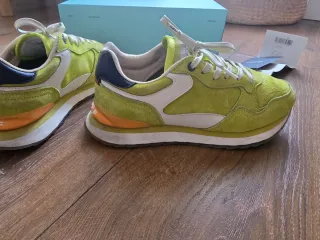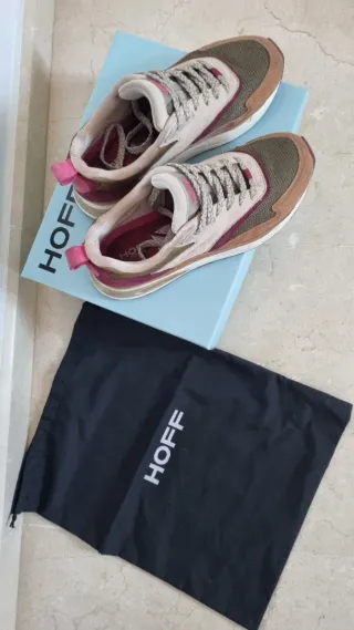 Zapatillas de la marca HOFF en tonos beige y verde. Perfectas para un estilo casual. Talla 38. Muy cómodas con amortiguación. Se incluye caja original y bolsita para viaje que aparece en la fotografía. Se entregan limpias. - Diseño deportivo. - Cordones a tono. - Detalle de color en el talón.