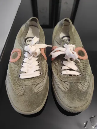 Zapatillas de la marca Aro en talla 36. Combinan tonos verde oliva y detalles en rosa. - Cierre con cordones. - Detalle circular en el lateral.