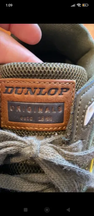 Zapatillas Dunlop Originals con un diseño moderno y cómodo. - Etiqueta de cuero marrón con el logo de Dunlop. - Detalle Originals estd. 1888 en la etiqueta. - Combinación de colores marrón y verde.