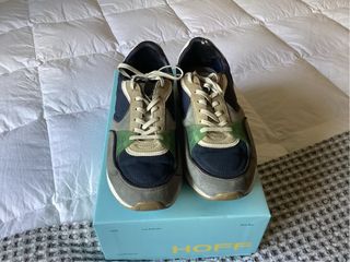 Zapatillas de la marca Hoff con un diseño moderno y detalles llamativos. - Combinación de colores azul, verde y beige. - Materiales de calidad en su construcción.