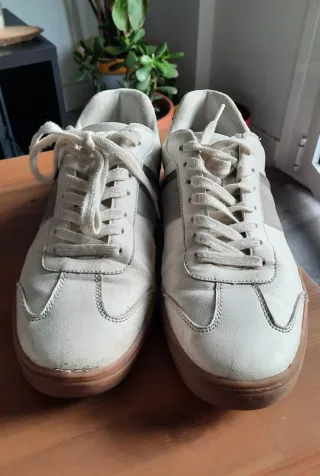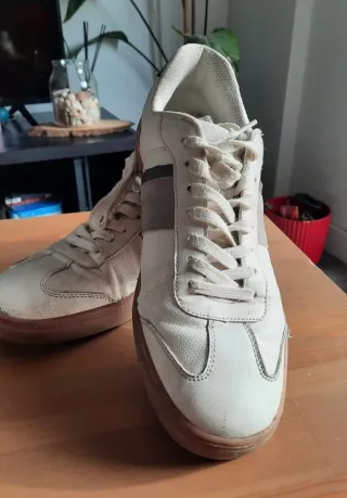 Zapatillas casual de Inextenso. Diseño minimalista de color blanco con detalles verde oliva. Talla 44. En buen estado, poco usadas.