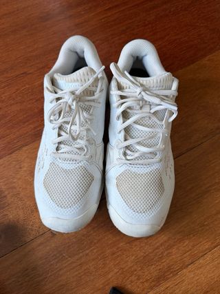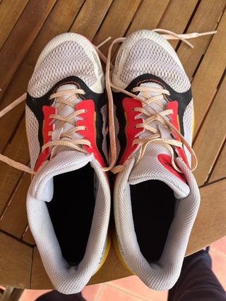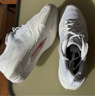 Zapatillas de deporte diseñadas para jugar al tenis. Son cómodas y ligeras. - Parte superior de malla transpirable. - Cierre de cordones. - Suela de goma para mayor agarre. Usadas solo 3–4 veces. Me quedan pequeñas. Suela prácticamente nueva. Tela transpirable con ligera marca de uso (ver fotos).