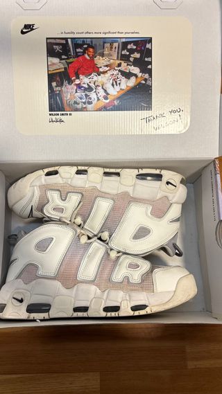 Zapatillas Nike Air More Uptempo edición especial Wilson Smith III. Un diseño icónico con detalles únicos. - Color blanco y rosa. - Inspiradas en Wilson Smith III. - Incluye foto y firma de Wilson Smith III.