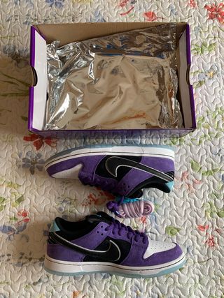 Zapatillas Nike Dunk SB de la colaboración con Hayley Wilson. Un diseño llamativo y único. -Tengo factura oficial de Nike - Parte superior de gamuza morada y detalles en blanco y negro. - Swoosh lateral en negro. - Suela translúcida con toques celestes. - Detalle gráfico en el talón.