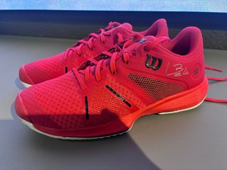 Zapatillas de pádel Wilson en color Fucsia con detalles azul, Diseñadas para ofrecer comodidad y rendimiento en la pista. Muy Buen estado - Parte superior de malla transpirable. - Suela de goma para un agarre óptimo. - Cierre de cordones para un ajuste seguro.