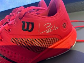 Zapatillas de pádel Wilson Bela en color rojo. - Diseño deportivo y moderno. - Logo Wilson en negro. - Firma de Bela visible.