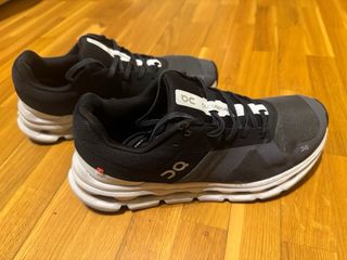 Zapatillas deportivas ON Cloudrunner en color negro y gris. Diseñadas para ofrecer comodidad y rendimiento. Bastante usadas pero sin desperfectos y perfectamente válidas para uso diario. - Parte superior de malla transpirable. - Suela con tecnología CloudTec®. - Cierre de cordones. - Detalle del logo ON en los laterales. - 100% originales. - Plantillas nuevas a estrenar Wilson.