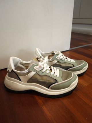 Zapatillas de Zara en tonos verdes y oliva, talla 37. Un diseño moderno y cómodo. - Combinación de materiales en el exterior. - Cordones blancos. - Suela gruesa.