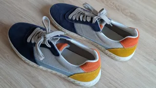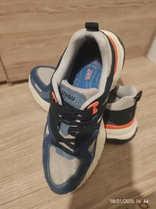 Zapatillas deportivas de la marca Zara, perfectas para el día a día. - Combinación de azul y detalles en naranja. - Cierre con cordones. - Suela de goma.