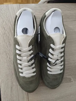 Zapatillas de la marca Zara en color verde y detalles en beige. - Diseño moderno y casual. - Cierre con cordones. - Material exterior de ante.