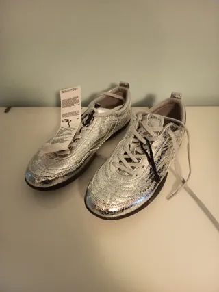 Zapatillas de diseño llamativo en color plateado. - Acabado brillante. - Cierre con cordones. - Suela oscura.