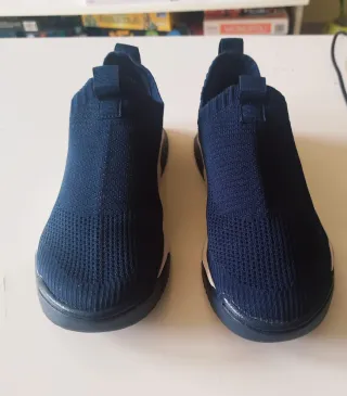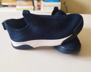 Zapatillas de tejido elástico azul marino de Zara,diseño slip-on con tirador trasero, están usadas pero no tienen ningún defecto de mancha u orificio, la talla dice 35 pero es una 36, la suela me pare en una pintura negra y por eso está así. Están en muy buenas condiciones.