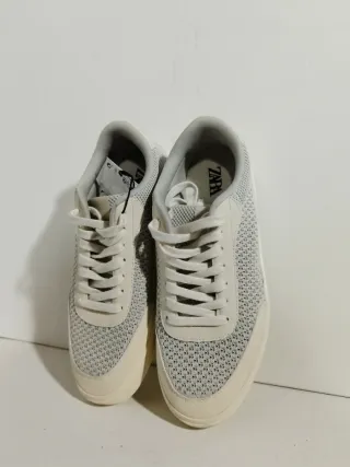 Zapatillas de la marca Zara en tonos beige y blanco. Un calzado cómodo y versátil. Se han usado en 5 ocasiones. - Diseño moderno. - Cierre con cordones. - Suela de goma.