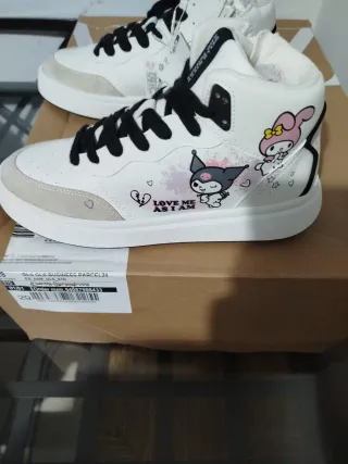 Zapatillas tipo basket de Zara con diseño de Kuromi y Sanrio. - Cierre con cordones y cremallera lateral. - Detalle de ante en la puntera y laterales. - Cuello acolchado para mayor comodidad. Nuevas a estrenar, con etiqueta y bolsa de Zara, las vendo porque me confundí a la hora de hacer el pedido y compré dos pares por error