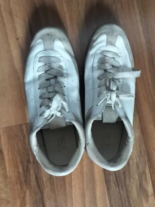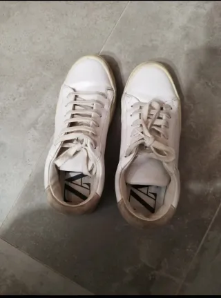 Zapatillas deportivas de Zara en muy buen estado. Talla 40. - Combinación de colores beige y blanco. - Detalle de cordones con estampado. - Materiales textiles y sintéticos.