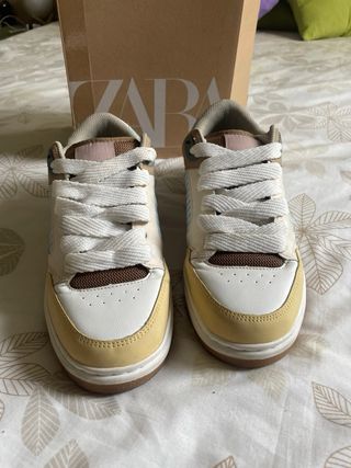 Zapatillas deportivas de Zara con un diseño moderno y versátil. - Combinación de colores beige y blanco. - Cierre con cordones. - Suela de goma.