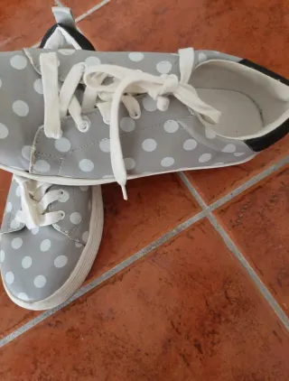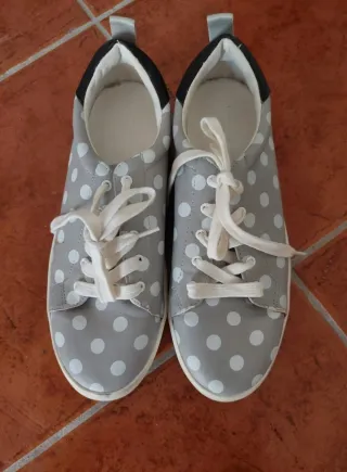 👟Zapatillas de la marca Zara con un divertido estampado de lunares. 🧵Diseño de lunares blancos sobre fondo gris. 🔐Cierre con cordones blancos. 📌Detalle en la parte trasera.