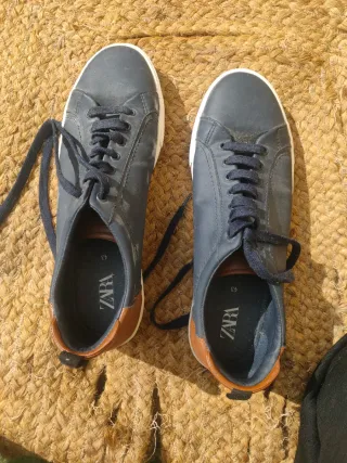 Zapatillas casuales de la marca Zara. - Exterior de material sintético azul. - Detalle en la parte trasera de color marrón. - Cierre con cordones. Algunas manchas - Suela blanca.
