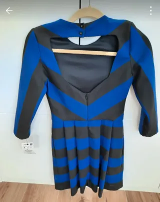 Vestido de la marca Zara con un diseño de rayas llamativo. Ideal para un look moderno. - Mangas largas. - Corte skater. - Espalda con detalle especial. Corte Skater: Ajustado a la cintura y con falda de tablas con mucho vuelo. Espalda WOW: Tiene una abertura trasera súper elegante que se cierra con dos botones en el cuello. Versátil: Queda genial tanto con tacones para un evento como con zapatillas y una biker de cuero para el día a día. Si quieres hacerte una idea de cómo queda, haz una imagen con IA.
