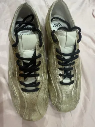 Zapatillas de la marca Zara en color dorado y blanco. - Diseño moderno y llamativo. - Cierre con cordones negros. - Detalle de logo en la lengüeta.