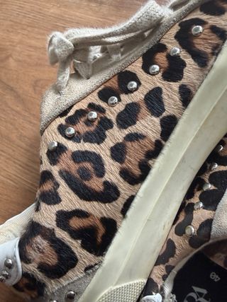Zapatillas de la marca Zara con un llamativo estampado animal. - Diseño con tachuelas metálicas. - Combinación de ante y tejido. - Cierre con cordones. se retira por El Clot