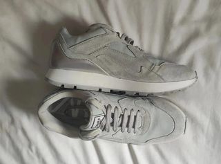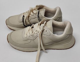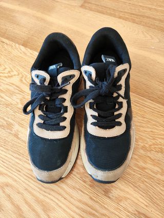 Zapatillas deportivas de la marca Zara, en buen estado. Ideales para un look casual y cómodo. - Diseño de dos tonos, beige y blanco. - Material de la parte superior: combinación de nylon y ante. - Suela de goma. - Cierre con cordones.