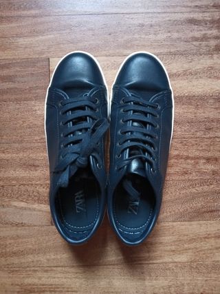 Zapatillas de piel de Zara en color negro. Un básico para tu día a día. - Cierre con cordones. - Suela gruesa. - Diseño casual.